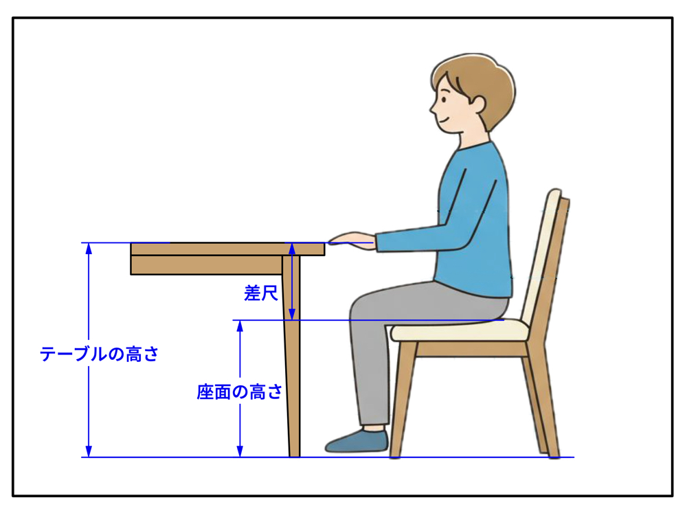 差尺が小さすぎる場合(椅子が高い): 顔からテーブルまでの距離が遠くなり、食事をする際に前かがみの姿勢になってしまい、姿勢が悪くなります。