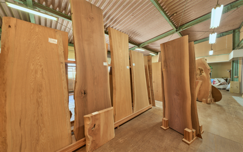 当社ショールームには、迫力ある一枚板も多数展示しております。自然が生み出した唯一無二の木目や形を活かした一枚板は、ダイニングテーブルやカウンターにおすすめです。