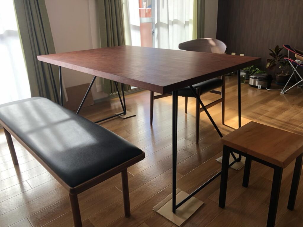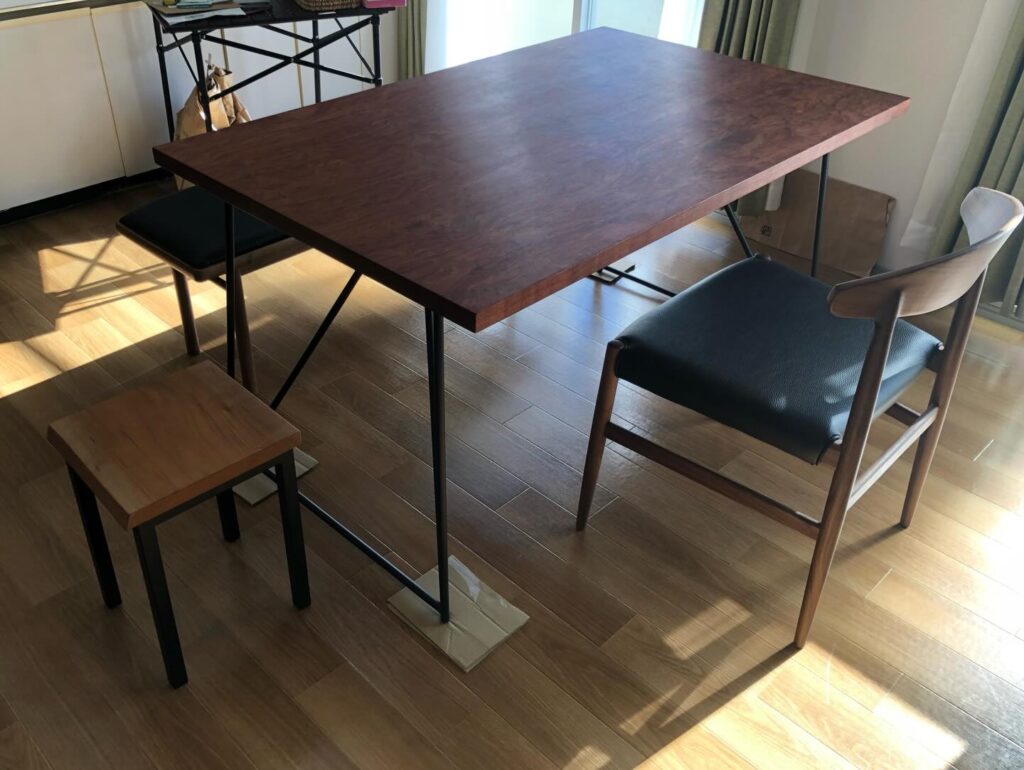 テーブルの華奢な鉄脚と、サクラ天板のスツール、ウォールナットのダイニングチェア座面のブラックがマッチして統一感が出ていますね⭐️